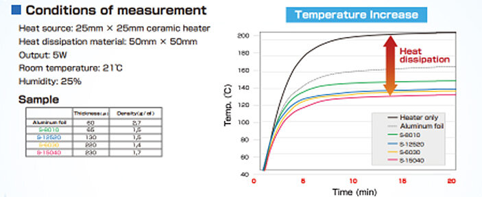 M-thermo heat conductive material is a sheet of thermal conductive filler made by our paper making and processing technology. Although its specific gravity is about 1/2 of aluminum, it has heat dissipation performance equivalent or superior to that of aluminum foil. It is also flexible and does not crack or break, so it can be processed into various shapes.